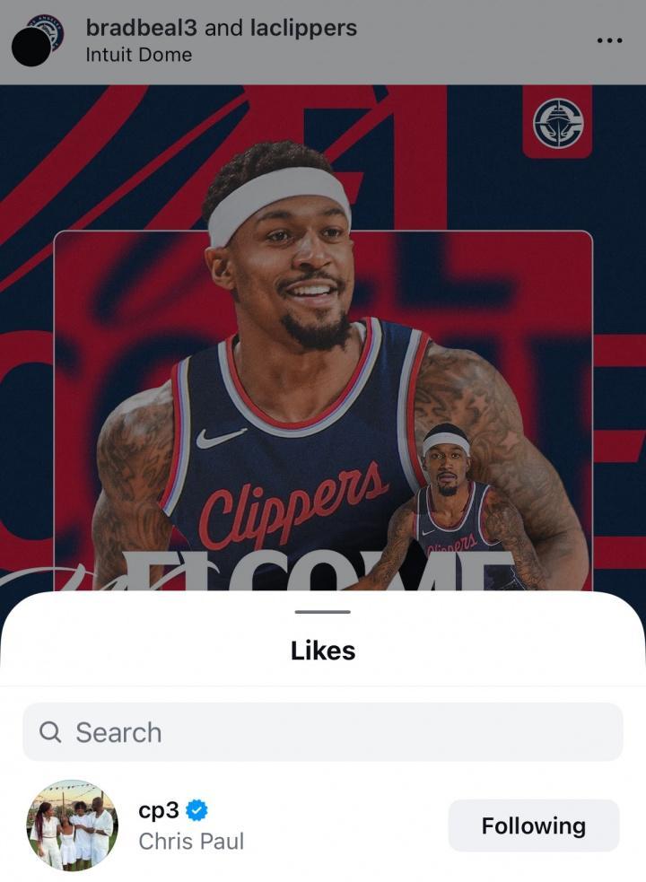 快船官方Instagram发布欢迎比尔的海报,前快船后卫、自由球员保罗点赞。